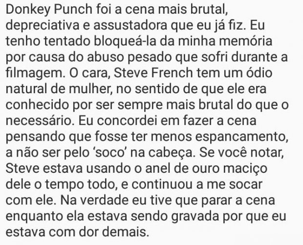 Sinto muito aos moralistas de plantão ai…mas o primeiro relato já demostra que a culpada são elas mesmas, ela mesmo sabe que tipo de cena é “Donkey Punch” ela mesmo sabia que o ator tinha fama de ser violento e ela com as próprias pernas decidiu ir até lá…cada caso um caso….mas em sua grande maioria as mulheres entram na Industria Porno porque querem…por causa do dinheiro fácil…depois vem reclamar…e nada de mimimi falando que eu sou babaca…ou que eu tenho uma forma de pensar machista e etc….o que eu o falando é um simples fato….então não tome as dores e venha bancar uma de cavaleiro branco de atriz porno.