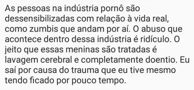 Maluco, vai se tratar!! Mimimi o caralho…isso são atrizes falando de determinados segmentos, de quando elas iniciaram no pornô! Em produtoras gigantes dificilmente acontecem essas coisas…agora vai me dizer que uma Eva Lovia da vida teve que se sujeitar a essas coisas pra chegar onde chegou, pq “faz parte”…não viaja…essas parada não são normais não. Existem, mas não deixa de ser escroto