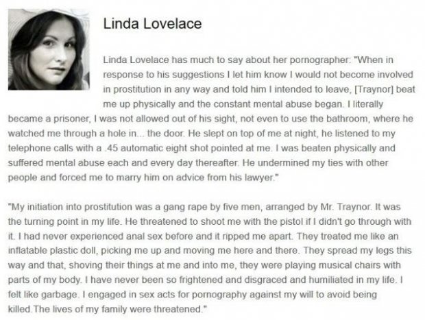 Quer dizer que toda a carreira da Linda Lovelace é estupro assistido? oO Ela fazia pornô e conheceu esse cara ou ela nunca quis fazer pornô e foi obrigada a vida inteira? Que doidera esses depoimentos, tá amarrado