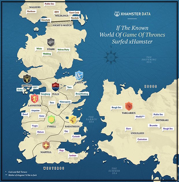 Em homenagem ao final da 7.º temporada de Game of Thrones, o xHamster resolveu listar quais seriam os termos de buscas mais procurados em sua plataforma baseando-se em momentos marcantes da saga e nas características de cada casa/região descritas na série/livros.