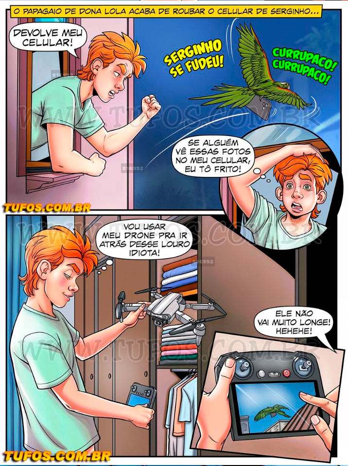 Serginho acaba de ter o celular roubado pelo papagaio de Dona Lola! Aflito com a possibilidade de alguém pegar seu aparelho lotado de nudes da Dona Mama, o rapaz tira um drone do armário para perseguir o ladrãozinho pelo céu. Mas a ideia não dá muito certo, já que o papagaio assustado, entra na primeira janela que encontra, justamente o quarto onde está rolando a maior suruba…